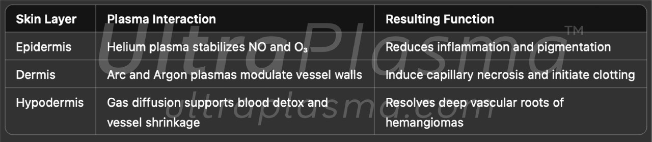 Hemangiomas—benign vascular tumors characterized by an abnormal proliferation of blood vessels—pose both aesthetic and medical challenges. Traditionally managed with laser therapy, corticosteroids, or surgical intervention, modern dermatology now embraces plasma medicine as a revolutionary alternative. UltraPlasma™ introduces a next-generation, multi-platform plasma system that integrates arc plasma, argon plasma, and helium plasma, controlled via proprietary software-hardware output spectrum modulation. This system targets the epidermal, dermal, and hypodermal vasculature, improving outcomes through precision oxidation and gas-mediated modulation.