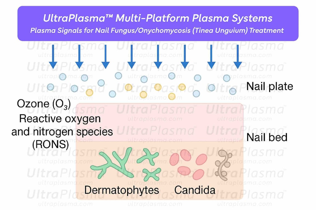 Onychomycosis (tinea unguium) is a prevalent fungal infection of the nail unit, often caused by dermatophytes, Candida species, and nondermatophytic molds. Traditional antifungal therapies suffer from long treatment durations, recurrence, and limited nail penetration. The UltraPlasma™ multi-platform plasma system—utilizing arc, argon, and helium plasma technologies—offers a novel, non-invasive treatment modality. This review details the mechanism of UltraPlasma™ in fungal nail infections, emphasizing its interaction with nail layers, pathogen types, and the biochemical activity of generated reactive gases such as ozone (O₃), nitric oxide (NO), and reactive oxygen/nitrogen species (RONS). Figures illustrate emission spectra, cross-sectional nail penetration, gas interactions, and clinical progress. The integration of photothermal, photochemical, and bioelectric effects renders this method an effective solution for resistant or recurrent onychomycosis.