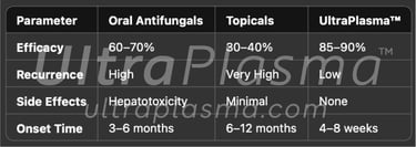 UltraPlasma™ revolutionizes onychomycosis management by combining high-precision thermal disinfection, gas-phase chemistry, and regenerative biophysics. It is particularly effective in cases resistant to systemic therapy or in patients contraindicated for oral antifungals. The layered treatment strategy addresses both superficial fungal structures and deep-seated matrix infections, ensuring long-term resolution.